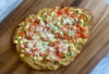 - Top each flatbread with 4 tablespoons of the following, tomato, zucchini, and red bell pepper.